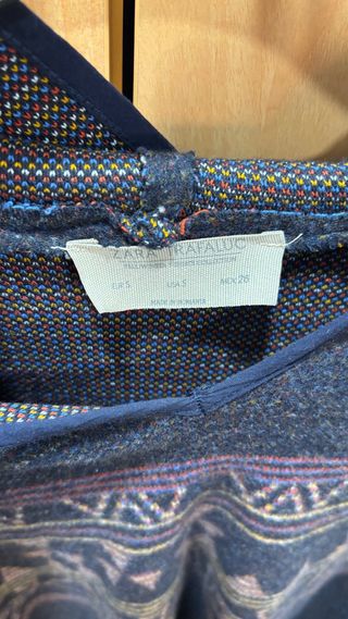 Poncho de Zara con un diseño étnico y flecos. - Estampado geométrico en tonos vibrantes. - Flecos decorativos en los bajos y mangas. - Tejido suave y cómodo. Usado pero en muy buen estado