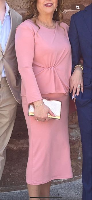 Vestido rosa midi, muy elegante, una manga estrecha y otra hace una capa, con fruncido en la cintura, raja en el lateral . Solo lo he usado en una ocasion . Puedo mandar mas fotos por privado .