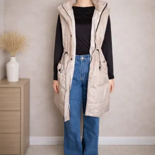 Chaleco largo de color beige, perfecto para añadir una capa extra a tu atuendo. - Diseño acolchado. - Capucha integrada (se puede quitar, va con cremallera) - Cintura ajustable con cordón. - Bolsillos laterales con cierre de botón.
