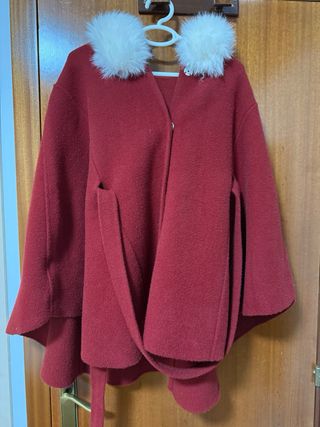 Preciosa capa de color burdeos, ideal para abrigarse con estilo. - Diseño con capucha. - Adornada con dos pompones blancos en la capucha. - Incluye cinturón para ajustar la cintura.