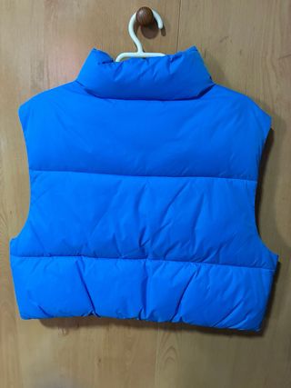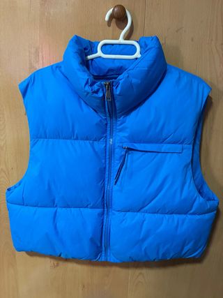 Chaleco acolchado de color azul, perfecto para añadir una capa extra de abrigo. - Diseño sin mangas. - Cuello alto. - Cierre de cremallera frontal. - Bolsillo con cremallera en el pecho.