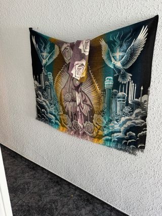 Poncho artesanal con un diseño vibrante y detallado de la Virgen de Guadalupe. - Diseño multicolor con degradado. - Imagen central de la Virgen de Guadalupe. - Motivos de ángeles y rosas. - Acabado con flecos.