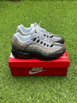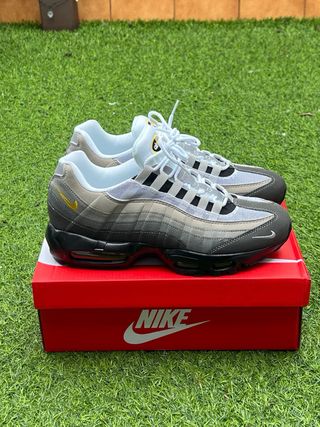 Zapatillas Nike Air Max 95 en tonos beige y gris. Diseño icónico con capas superpuestas. - Parte superior de malla y gamuza. - Unidad Air Max visible en la suela. - Cierre con cordones blancos.
