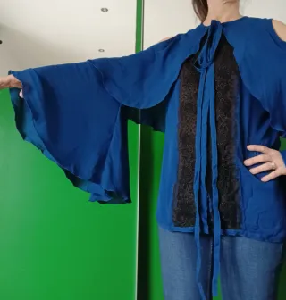Camisa fluida con un diseño elegante y detalles de encaje. - Mangas acampanadas. - Escote con lazada. - Panel frontal de encaje negro. Tiene una tara en la espalda que la tapa la capa