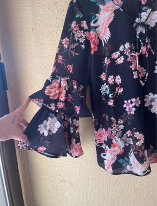 Preciosa blusa con un estampado floral y de aves exóticas. Presenta un escote en V con cordones y mangas acampanadas con volantes. - Diseño con grullas y flores. - Mangas acampanadas de doble capa. - Cierre de cordones en el escote. DESCUENTO POR LOTES