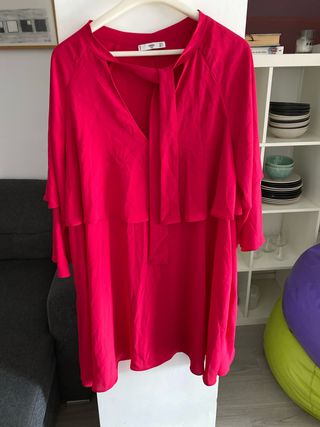 Vestido de la marca Mango en color rosa. - Diseño con lazada en el cuello. - Mangas acampanadas. - Capa superpuesta en el pecho.