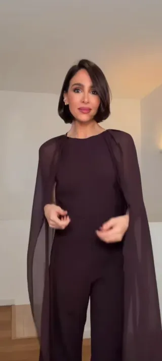Elegante mono de color marrón chocolate. Presenta un diseño con mangas tipo capa y aberturas. Lucido por Rocío Osorno - Manga larga con aberturas. - Pantalón de pierna ancha.