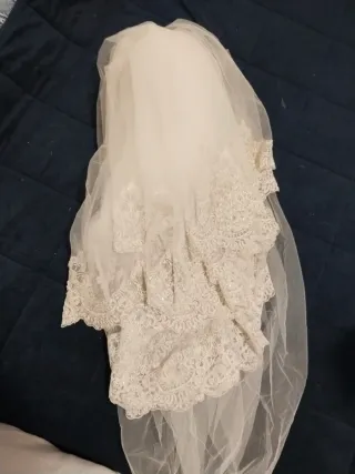 Elegante velo de novia con detalles de encaje y pedrería. - Diseño en capas. - Adornos de encaje en el borde. - Detalles de pedrería y lentejuelas.