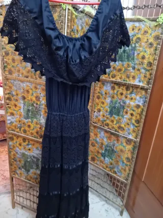 Vestido elegante para señora, ideal para eventos especiales. Medidas : de axila a axila 60 x2. 120 Cintura 114cms Cadera122cms Largo desde hombro 105 cms - Diseño con escote en V. - Detalle floral en el hombro. - Mangas tipo capa. - Tejido ligero y fluido.