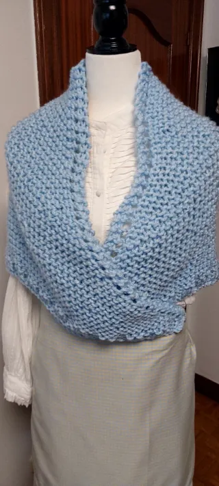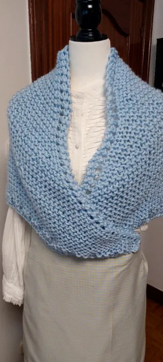 Preciosa toquilla tejida a mano en un suave color azul. - Diseño abierto y ligero. - Acabado con puntilla. - Ideal para complementar cualquier atuendo.