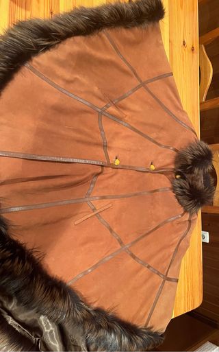 Capucha brillante de color dorado, ideal para complementar disfraces. - Material con acabado metálico. - Mide unos 140 cm - Tiene una mancha desgastada por dentro. Por fuera pasa desapercibido.
