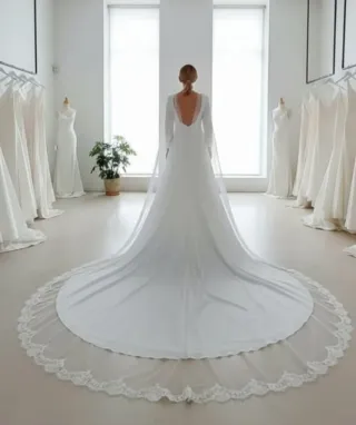 Elegante capa de novia con un diseño espectacular y una cola larga que aporta un toque de ensueño a tu look nupcial. Solo la utilicé para la ceremonia de boda, está impecable. - Diseño con encaje en el borde. - Cola larga y fluida.