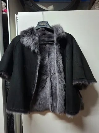 Elegante capa reversible con un diseño sofisticado. - Un lado en piel negra. - Otro lado con forro de pelo gris.