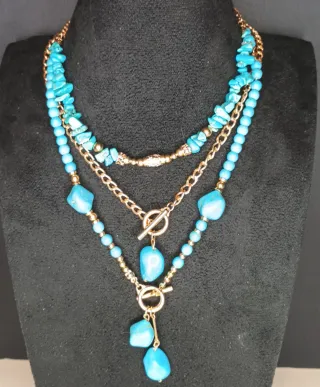 Precioso collar de tres capas con turquesas naturales y detalles dorados. Un accesorio llamativo y elegante. - Diseño de tres cadenas entrelazadas. - Elaborado con turquesas de forma irregular. - Cierre tipo T-bar dorado.