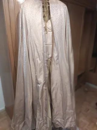 Conjunto de vestido y capa de estilo medieval. El vestido tiene un diseño jacquard y la capa es de satén brillante. - Vestido con corpiño estructurado. - Falda larga y fluida. - Capa amplia con forro. - Cierre con cordones dorados en el escote.