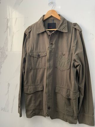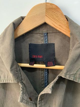 Chaqueta de hombre de la marca Zara, con un diseño moderno y versátil. - Color verde oliva. - Cierre de botones. - Bolsillos frontales con solapa. - Detalle de hombreras.