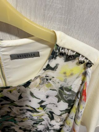 Vestido elegante con un estampado floral vibrante y llamativo. Su diseño combina diferentes flores y hojas creando un efecto visual único. - Diseño asimétrico con capas de tela. - Mangas cortas con volante. - Cremallera trasera para cerrar.