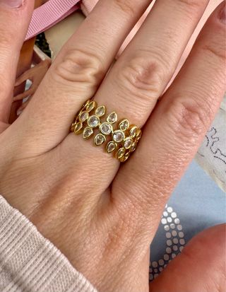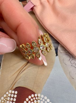 Elegante anillo con un diseño único y detalles brillantes. - Acabado en tono dorado. - Decorado con múltiples piedras transparentes. - Diseño en varias capas.