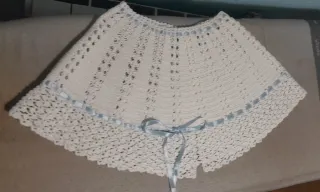 Preciosa capa de crochet hecha a mano, con un diseño delicado y elegante. Perfecta para añadir un toque especial a cualquier atuendo. - Tejido de crochet intrincado. - Detalles de cinta azul y lazo. - Acabado con borde festoneado.