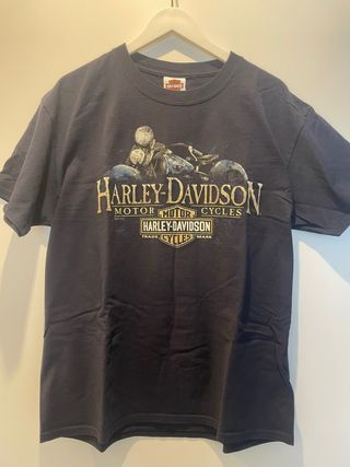 Camiseta negra con estampado de Harley-Davidson. - Diseño frontal con motocicleta. - Logo de Harley-Davidson Motor Cycles.