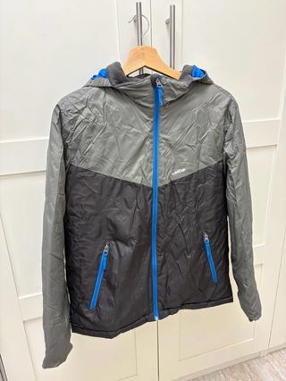 Abrigo de nieve de la marca Wedze, perfecto para actividades al aire libre. - Diseño bicolor en negro y gris. - Cremallera frontal azul. - Dos bolsillos laterales con cremallera azul.