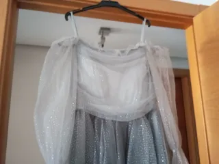 Precioso disfraz de princesa hecho en un tejido de tul con pequeños puntos plateados.Mangas abullonadas, con diferentes posiciones. - Forro interior de tirantes regulables, con sujetador preformado. -Cuerpo ajustado y preciosa falda de vuelo. - Cierre con cremallera en la espalda. - Vale también para una talla 42. - Diseño brillante y elegante. - Tejido ligero y vaporoso, con dos capas de tul. - Ideal para eventos especiales, puede ser perfectamente también un traje de noche o para cualquier ceremonia o evento. - No se aprecia en las fotos lo bonito que es y queda puesto genial.