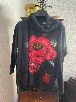 Poncho oversize de la marca Desigual con un llamativo estampado de flores rojas y detalles de lentejuelas. - Diseño con cuello alto - Mangas amplias - Flecos en el bajo - Estampado floral grande en el frontal - Detalles de lentejuelas brillantes Las medidas están en las fotos. Pone talla S, pero es perfectamente un poncho. Talla única