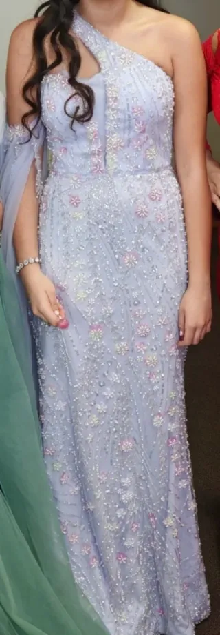 Elegante vestido de fiesta largo, con un diseño asimétrico de un solo hombro y detalles florales bordados. - Color principal: morado lavanda. - Adornos: flores bordadas en tonos rosa y blanco, pedrería y cuentas. - Diseño: corte sirena, escote asimétrico. - Manga: una manga larga con detalle de capa. Hago envíos