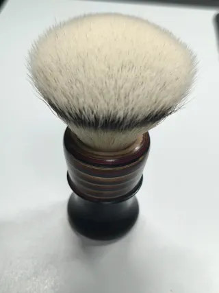 Brocha de afeitar con mango de diseño multicapa y fibras sintéticas. Mango difícil de conseguir. - Mango con diseño de capas de colores. - Fibras sintéticas suaves para la piel. - Nudo G5, muy suave y espeso. - Nudo tipo Fan (abanico) - Apenas usada en tres ocasiones