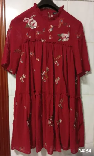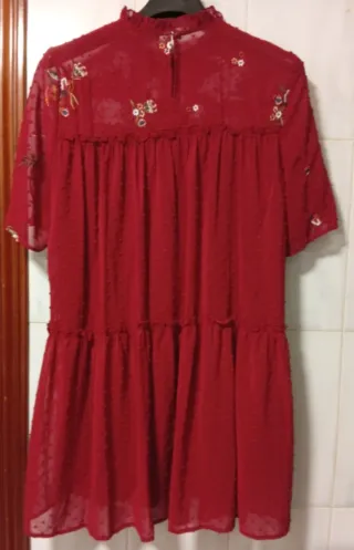 Vestido de tela ligera con un bonito estampado floral bordado y lentejuelas. -talla L pecho 100 largo 87. - Diseño de volantes en capas. - Cuello alto con detalle de volante. - Mangas cortas abullonadas.