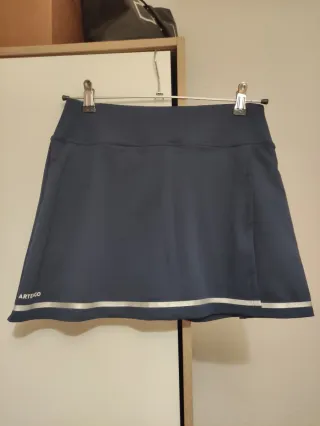 Falda pantalón deportiva de la marca ARTENGO en color azul. - Diseño con doble capa. - Cintura elástica. - Detalle de banda plateada en el bajo. - La malla short integrada tiene un bolsillo para las pelotas