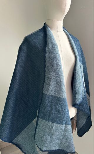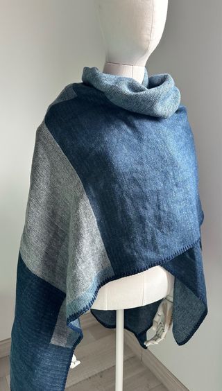 Poncho con diseño de bloques de color en tonos azules y grises. Su tejido suave lo hace ideal para añadir una capa extra de abrigo. - Diseño de bloques de color. - Acabado con pespuntes decorativos.