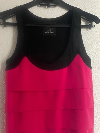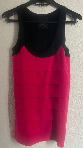 Vestido corto con diseño de capas en la parte delantera. - Combinación de colores fucsia y negro. - Diseño sin mangas. - Largo mini.