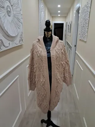 Poco uso, como nueva, sin defectos. Tiene mangas como una chaqueta pero el corte lo tiene tipo capa, amplia. Con capucha. Bonito color rosa. Muy original. El tejido es estilo cardigan pero con cuerpo, gruesa, calentita y suave. De talla es muy versátil, podría decirse que es una M-L, pero por su etsilo sirve desde S hasta XL.