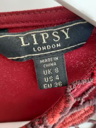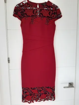 Elegante vestido granate de la marca Lipsy, con detalles de encaje floral. - Escote redondo con detalle de encaje. - Mangas cortas de encaje. - Adorno de encaje floral en el bajo. - Diseño con capas en la cintura.