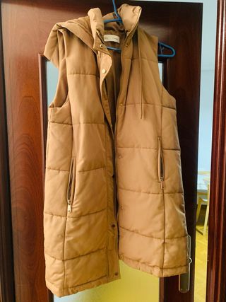 Chaleco acolchado con capucha, perfecto para añadir una capa extra de abrigo. Totalmente nuevo muy poco uso. - Cierre de botones a presión. - Bolsillos laterales con cremallera. - Cordones ajustables en la capucha.