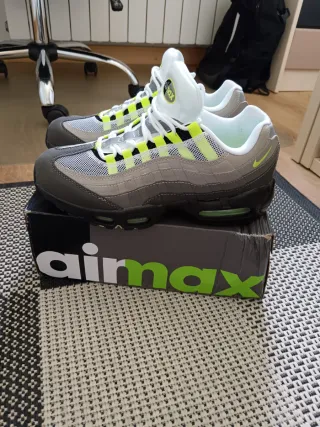 Zapatillas Nike Air Max 95 en tonos grises y detalles verdes. - Diseño icónico con capas superpuestas. - Unidad Air visible en la mediasuela. - Cordones con detalles fluorescentes.