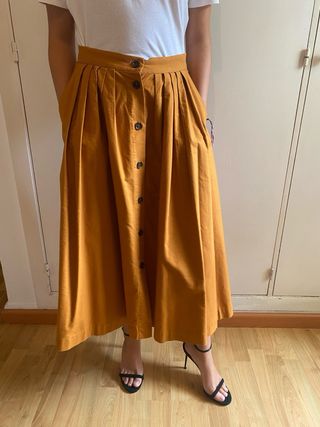 falda midi color camel claro. con pliegues tipo capa y botones centrales queda ideal en plano y con tacones. bolsillo laterales. talla m de hm