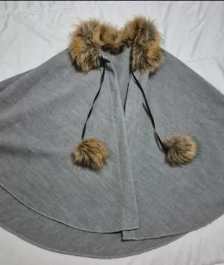 Preciosa capa de tejido suave con un diseño elegante. - Adornada con un cuello de pelo sintético. - Incluye dos pompones de pelo sintético colgantes. - Cierre con cintas negras.