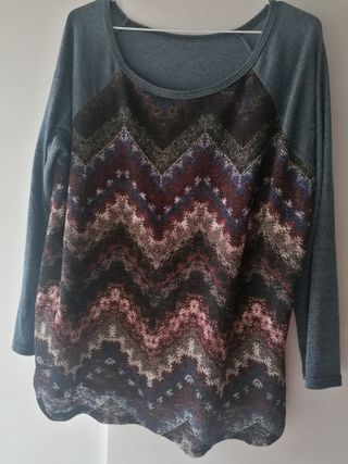 Suéter de doble capa gris con un diseño llamativo en azul, gris y rosa. Tejido suave y cómodo. Tiene bolitas, habría que pasarle la quita pelusas. Hago lotes y envíos. Descuento 1€ por cada cosa que añada de mi perfil. Y regalito!