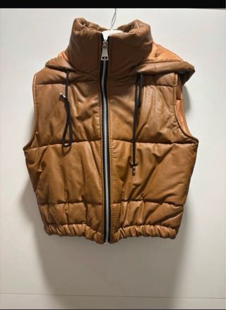 Chaleco acolchado de estilo moderno, perfecto para añadir una capa extra de abrigo. -chaleco corto sin usar - Diseño sin mangas. - Cierre frontal con cremallera. - Capucha integrada. - Cordones ajustables en la cintura.