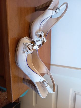 Elegantes zapatos blancos de fiesta. - Diseño abierto en la punta. - Adorno floral con pedrería. - Cierre de tira al talón.