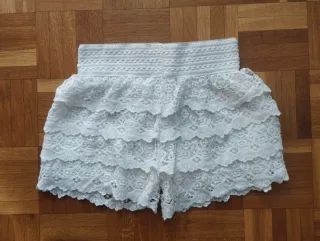 Pantalón corto de encaje blanco con un diseño de volantes. - Cintura elástica. - Tejido de encaje. - Diseño de volantes en capas. Composición exterior 100% algodón. Interior: 65% algodón, 35% polyester