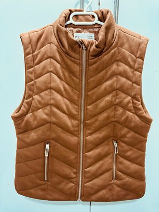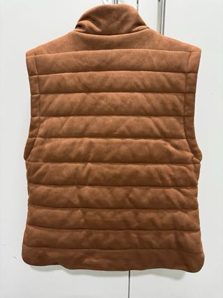 Chaleco acolchado para mujer con un diseño moderno y elegante. Perfecto para añadir una capa extra de abrigo con estilo. - Material exterior con acabado similar al ante. - Cierre frontal con cremallera. - Dos bolsillos laterales con cremallera.