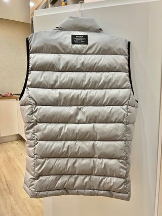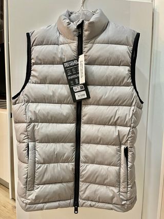 Chaleco acolchado Ecoalf, nuevo, en color gris, perfecto para añadir una capa extra de abrigo. Bolsillos con cremalleras, calido y ligero. - Diseño sin mangas. - Cierre de cremallera frontal. - Bolsillos laterales. - Ribete negro en los bordes.