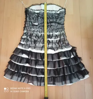 Vestido de fiesta con un diseño de volantes en cascada. Es un modelo sin tirantes que se ajusta al cuerpo. - Volantes en capas. - Diseño sin tirantes. - Cazoletas para el pecho y varillas en el corsé. - Navidad, Nochevieja, cóctel, evento, ceremonia, celebración, invitada...