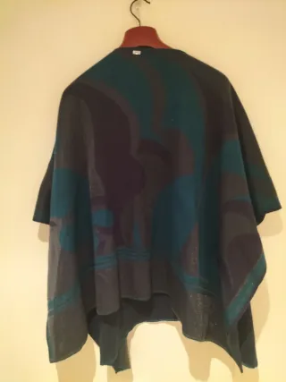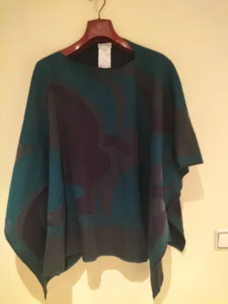 Poncho con un diseño moderno y llamativo. Marca ESCADA. Talla única (One Size). Altura 660 Longitud 1110 Pecho 2220 - Tejido suave y cómodo. - Estampado abstracto en tonos morados y verdes. - Corte amplio y favorecedor.