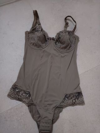 Body de la marca Belcor en color beige, con detalles de encaje. - Copas con diseño de puntos y bordado. - Adorno de encaje floral en los laterales. - Cierre de corchetes en la parte inferior.