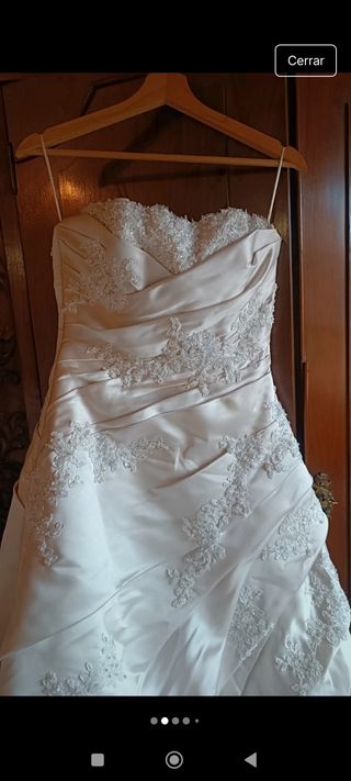 Elegante vestido de novia de Pronovias. - Diseño strapless con escote corazón. - Detalles de encaje y pedrería. - Falda voluminosa con varias capas. - Incluye cola.