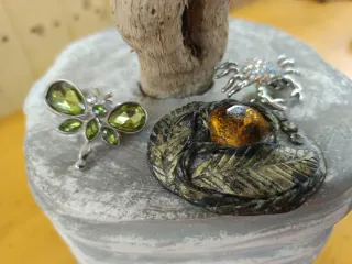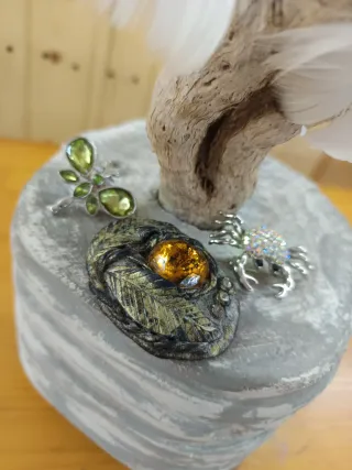 Este conjunto incluye tres broches decorativos. - Un broche con forma de mariposa con detalles verdes. - Un broche con forma de cangrejo adornado con pedrería. - Un broche central con diseño de hoja y piedra ámbar.